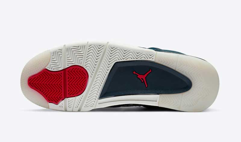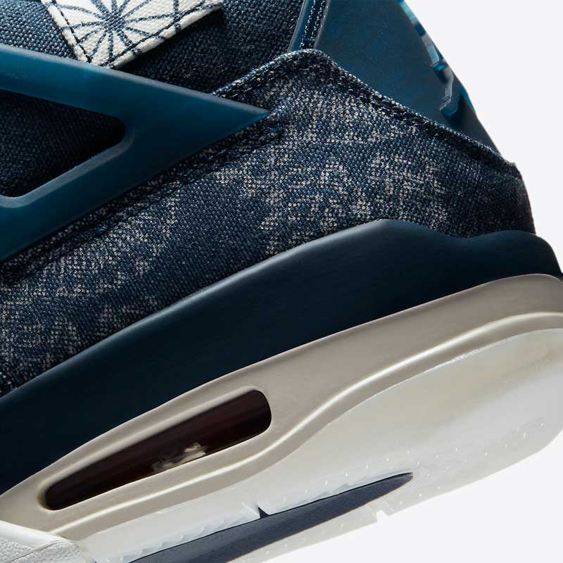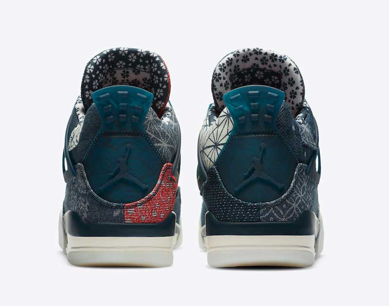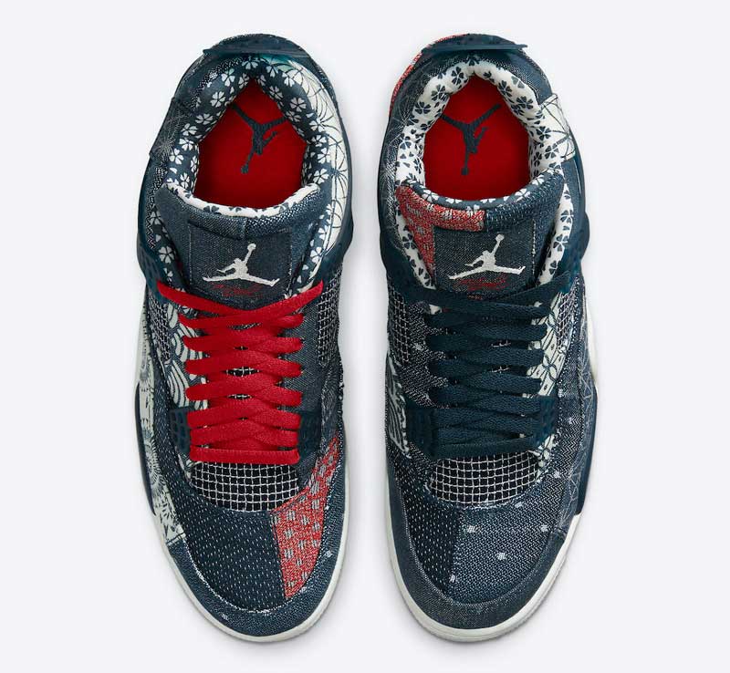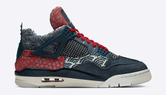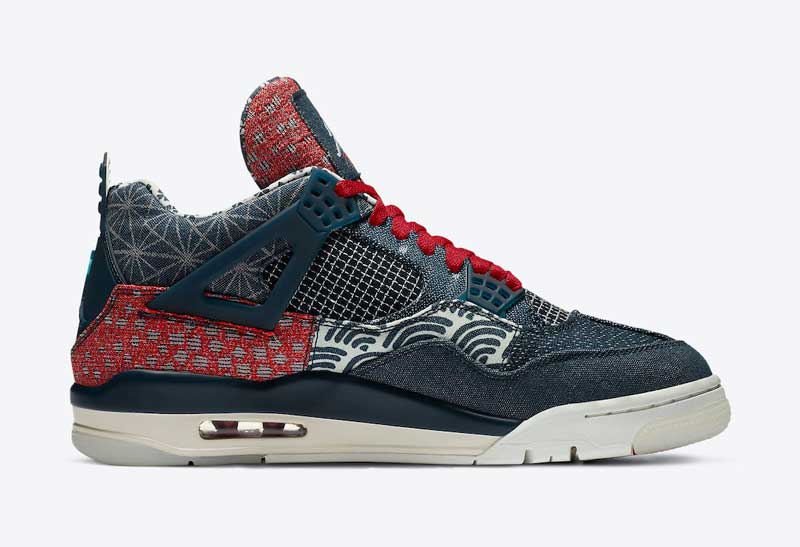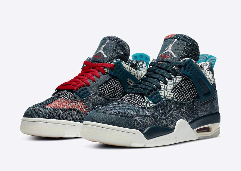 C’est peut-être pour raccommoder son manque d’idées que Jordan Brand a eu l’idée de recourir au Sashiko pour la Air Jordan 4. Le résultat est superbe, avec une paire dépareillée qui joue sur les touches de bleu et de rouge.