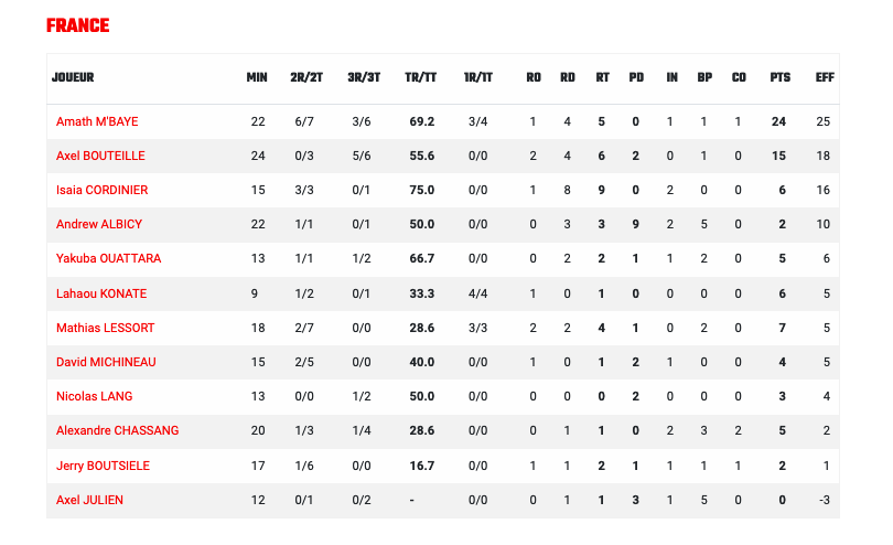 Sans leurs joueurs NBA ou d’Euroleague, les Bleus se sont appuyés sur Amath M’Baye, logiquement élu MVP de la rencontre avec 24 points et 5 rebonds. Accompagné par Axel Bouteille (15 points à 5/6 de loin) et mis sur orbite par Andrew Albicy (2 points, 9 passes), l’ailier fort de Karsiyaka, en Turquie, a ainsi parfaitement lancé la France.