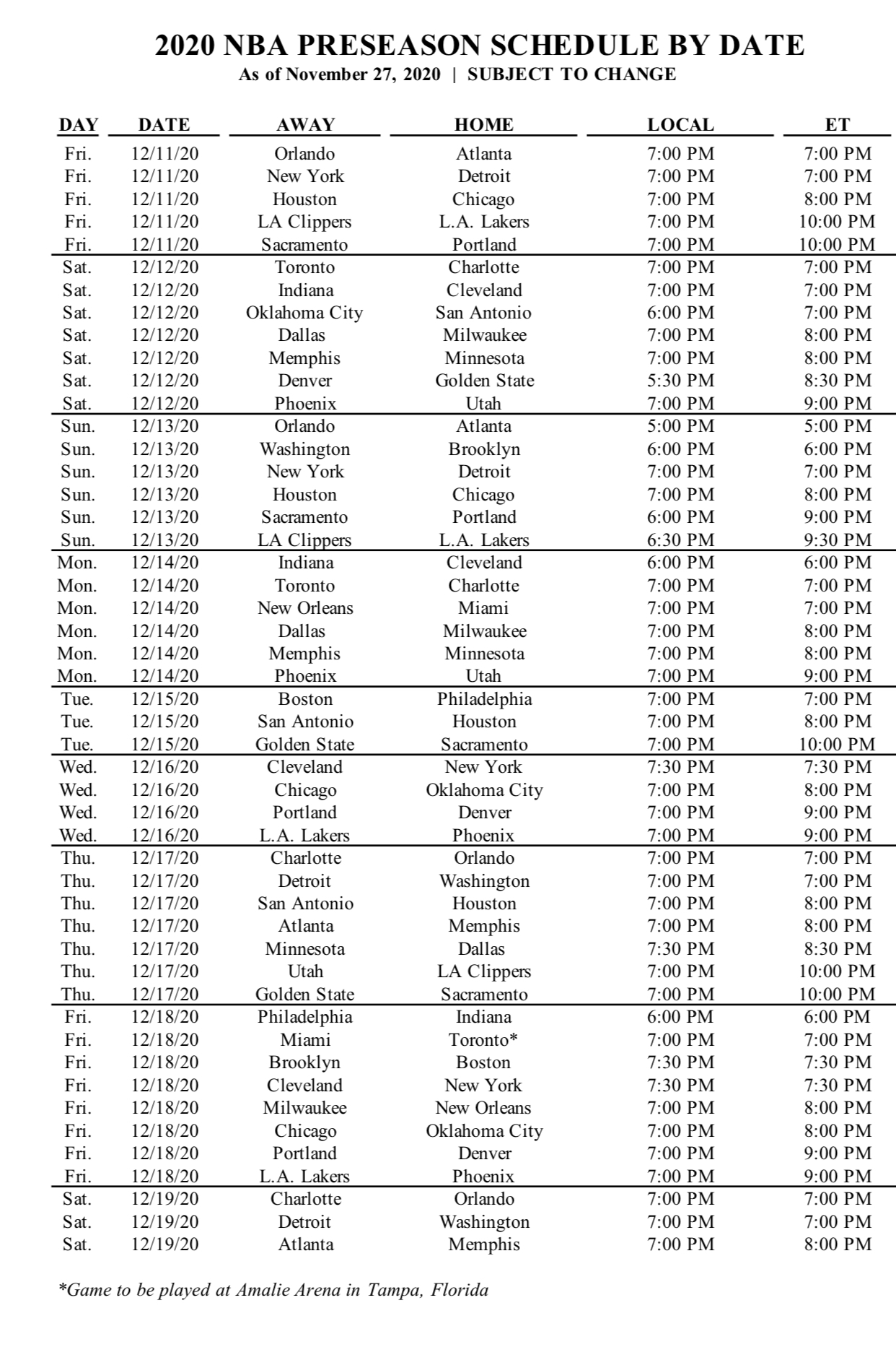 On notera que les Raptors joueront leur premier match à Tampa face au Heat, et ce sera l’Amelie Arena.