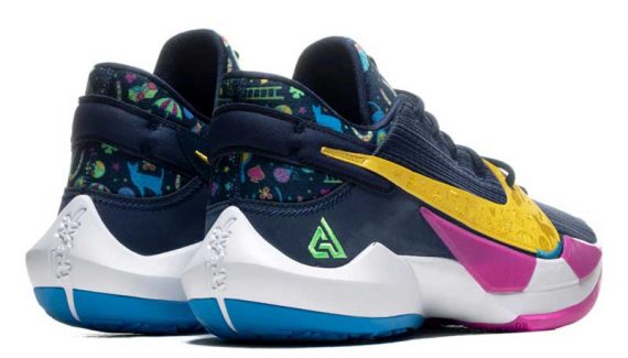 Des chats, une échelle, un parapluie, un trèfle, une coccinelle… Il se passe beaucoup de choses sur la prochaine teinte de la Zoom Freak 2. Sur une base marine, la chaussure reçoit des touches de jaune, de vert et de violet en plus de son motif très original.