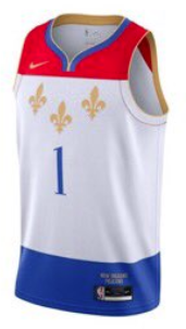 Celui de Memphis était un très solide candidat, mais pour une fois qu’on retrouve l’héritage français sur un maillot NBA, je ne pouvais pas ne pas le souligner. J’aurais d’ailleurs aimé que le rouge du haut du maillot soit plus étalé mais ces trois fleurs de lys sans aucune écriture sur le devant feraient presque chevaleresque. Le short portera la mention “NOLA” ainsi que ce liseré bleu qui complète donc le drapeau de la ville. Le surmaillot semble également tout à fait sympathique avec le même thème des fleur de lys de la Louisiane historique.