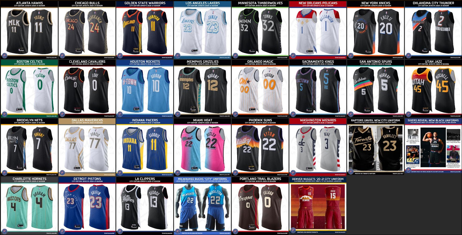Mentions spéciales : Denver (la skyline et les montagnes des logos passés, OK, mais c’est quoi cette couleur rouille ?), Detroit (sans imagination aucune mais dans les tons classiques au moins), Sacramento (un mélange des genres sans saveur… et arrêtons les surnoms de ville), Toronto (vexant bien malgré eux, car ils vont exceptionnellement évoluer à Tampa Bay cette saison).