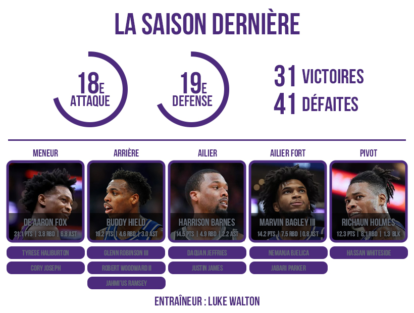 La Draft a également apporté un sacré talent en Tyrese Haliburton, un “combo guard” aux allures de Shaun Livingston, au même titre que Glenn Robinson III qui vient aussi d’arriver pour se relancer. Sur les ailes, c’est Harrison Barnes qui va occuper la majorité des minutes devant Jabari Parker, l’attaquant forcené sans aucune appétence défensive. Ce dernier pourrait même devancé dans la rotation par Daquan Jeffries que la franchise a prolongé sur deux ans. Nemanja Bjelica et Richaun Holmes sont également restés en place et seront importants pour solidifier la rotation de Luke Walton, respectivement pour étirer les défenses et offrir une résistance à l’approche du cercle.