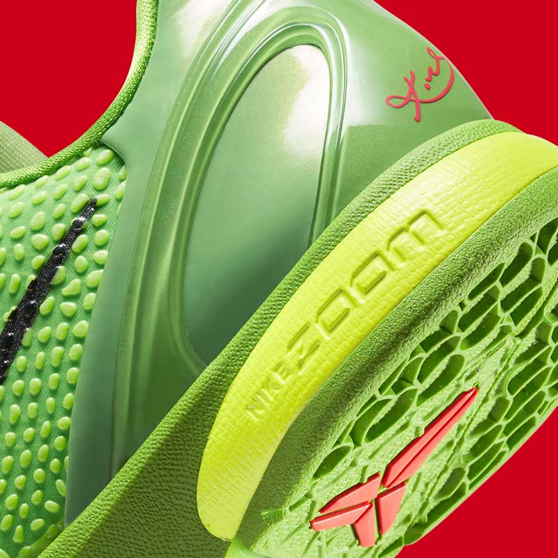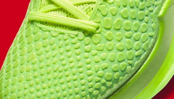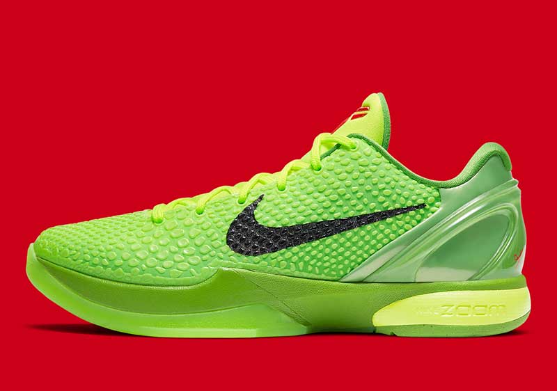 On savait depuis le mois de mai que la Kobe 6 préparait son retour. On l’attendait en 2021, mais le premier coloris arrivera finalement juste avant la fin de 2020. Et c’est plutôt logique. Car il s’agit de la teinte Grinch, qui faisait partie de la collection de Noël de Nike en 2010.