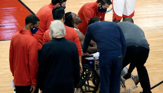Et c’est sur une chaise roulante que le petit meneur de jeu va quitter le terrain alors qu’évidemment, tout le monde craint une grosse blessure. Selon The Athletic, le premier diagnostic est bien une rupture du tendon d’Achille pour l’ancien scoreur de Campbell, même s’il faudra faire des examens complémentaires pour le confirmer.
