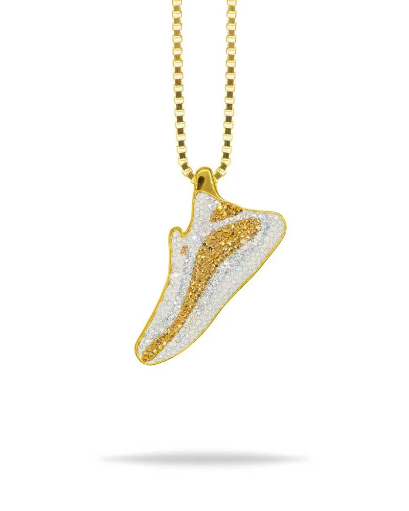 Sur une base blanc et or, l’artiste Californien Dan Life a ajouté 6149 cristaux. Toutes les paires disponibles ont été vendues pour 3 500 dollars. Un pendentif assorti, décoré de 371 cristaux, est également proposé pour 270 dollars. Là, il y a encore du stock.