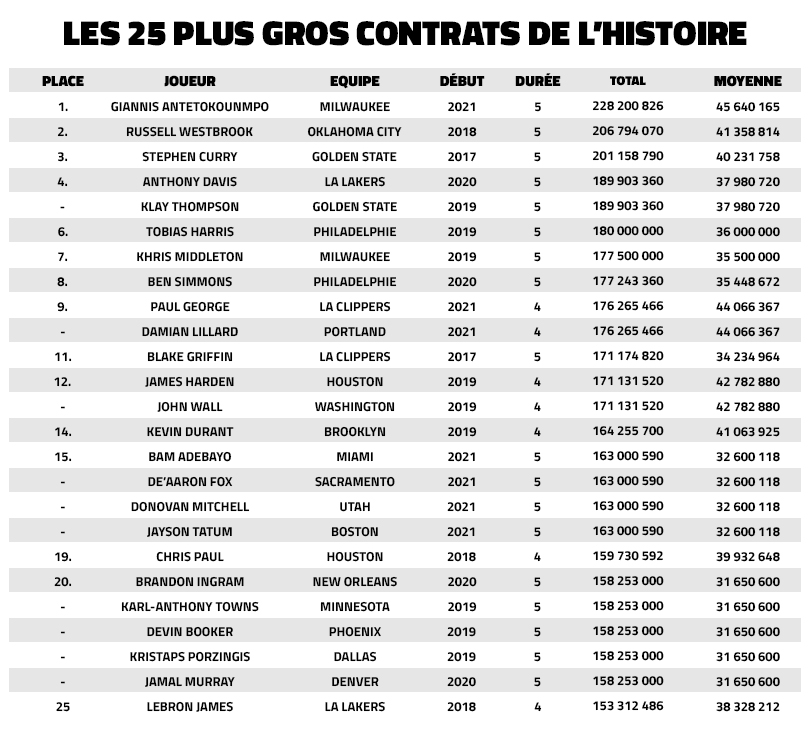 Il s’agit en tout cas du plus gros contrat de l’histoire de la NBA, hors renégociations sur six ans. En effet, James Harden et Damian Lillard ont obtenu davantage en négociant des prolongations en milieu de contrat.