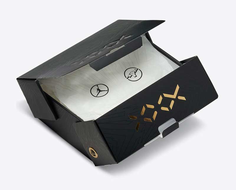 Des touches dorées viennent prendre place sur le logo, les dernières boucles des lacets, et même le bout des lacets. La précieuse teinte est aussi à l’honneur sur la semelle et la boite. Pour le reste, on retrouve une combinaison assez sobre de blanc, de rouge et de noir. Un soin particulier semble avoir été apporté à la partie arrière de la chaussure.