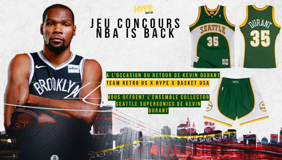 A partir de demain, Kevin Durant et la NBA sont de retour ! A cette occasion TEAM RETRO US x HYPE x BASKET USA vous proposent de gagner l'ensemble collector Seattle Supersonics de Kevin Durant.