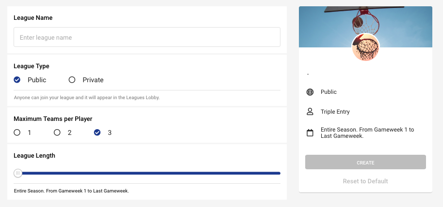Pour créer votre propre ligue, il vous suffit de cliquer sur « Create a league » et d’en définir les critères et options.