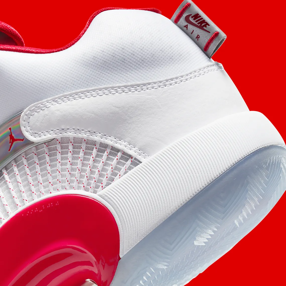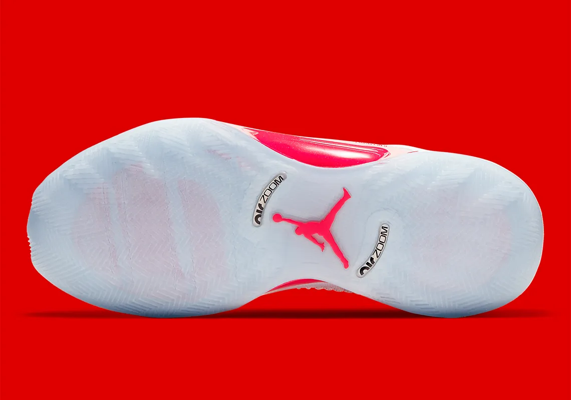 Après les touches dorées de la collaboration avec la marque Titan, le Jordan 35 se révèle dans un nouveau coloris très efficace à paraître début 2021 a priori, avec une Eclipse Plate et quelques détails rouge pour mettre en valeur un ensemble blanc.