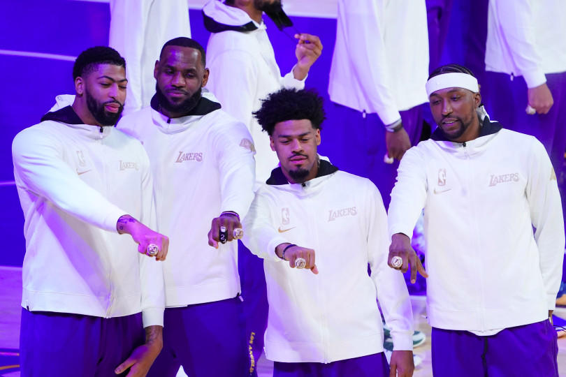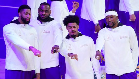C’était une cérémonie de remise des bagues de champion forcément très particulière. Sans public, et avec un protocole sanitaire qui n’a pas permis à Jeanie Buss de faire une remise individuelle, les joueurs de Los Angeles ont donc récupéré tour à tour le bijou, posé sur un piédestal, après un message vidéo de leur famille.