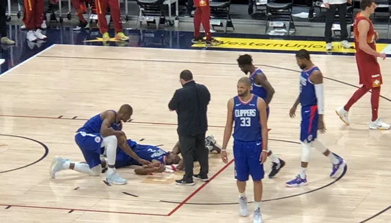 L'ailier des Clippers s'est retrouvé au sol, victime d'un coup de coude involontaire de Serge Ibaka. Au ralenti, on voit que c'est au moment de sauter au rebond que le Congolais frappe de plein fouet son coéquipier au visage.