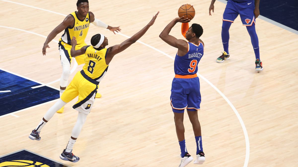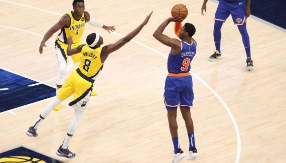 Le souci, c’est que ses coéquipiers ne sont pas dans un grand soir, et après douze minutes, les Pacers n’ont que deux points d’avance (28-26). Il faut dire que R.J. Barrett a pris le match par le bon bout avec une relation efficace avec Julius Randle et une étonnante adresse à 3-points.