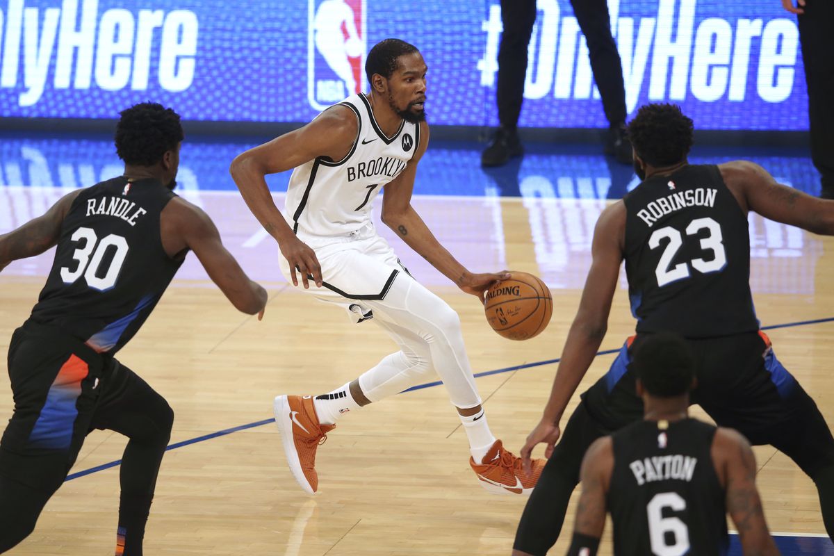 Kevin Durant allume de loin, mais Mitchell Robinson lui colle une bâche et récupère déjà quelques rebonds sur DeAndre Jordan. Julius Randle plante deux tirs à 3-points de suite, et les locaux sont devant (16-13).