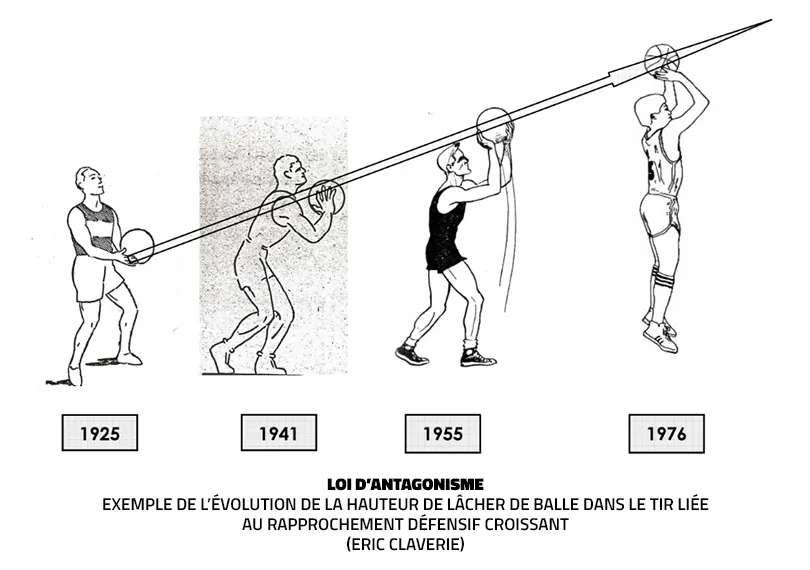 Cette modélisation physique en rappelle d'ailleurs une autre, beaucoup plus simple. Car dans les années 1920, à Paris, le très jeune Charles Laffargue, ingénieur des Arts et Métiers, écrit à 19 ans un premier fascicule, La technique du basket-ball, où il tente d'appliquer ses connaissances en physiques au basket.