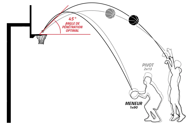 Enfin, l'angle de pénétration dans le panier doit être au plus proche de 45°. Pour les joueurs de “petite” taille, c'est assez facilement réalisable avec une trajectoire de shoot haute mais les pivots lâchent eux leur ballon beaucoup plus haut avec une technique de shoot classique, et leur angle de pénétration est donc plus faible. C'est donc principalement pour eux que la technique à la cuillère pourrait être utile, s'ils acceptaient de la tester…