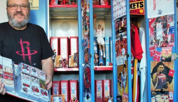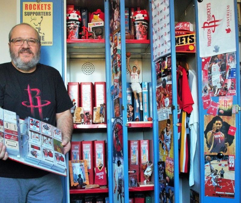 Pour comprendre son lien avec les Rockets, il n’y a qu’à jeter un œil à son vestiaire. Des casiers entiers décorés du rouge historique de la franchise texane, débordants d’objets en tous genres à l’effigie de Hakeem Olajuwon, Yao Ming, Tracy McGrady, James Harden et les autres. La collection d’Alain Larrouy a de quoi impressionner. À l’occasion, il arrive même que certains curieux viennent « visiter ». De là à ouvrir un musée… « Je ne sais pas ! », en rigole le quinquagénaire, basé à Toulouse et joint par téléphone.