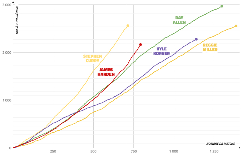 Leader de cette catégorie, Ray Allen le devance de 411 tirs, et cette nuit, le double MVP est devenu son dauphin en plantant son 2 561e panier primé en carrière, dépassant ainsi le total de Reggie Miller. L’ancienne gâchette des Pacers lui avait même préparé une surprise en intervenant, de chez lui, lors de la visioconférence d’après-match. “Tu inspires tellement de gamins, dont le mien” lui a dit Reggie Miller, avec son fils sur les genoux.