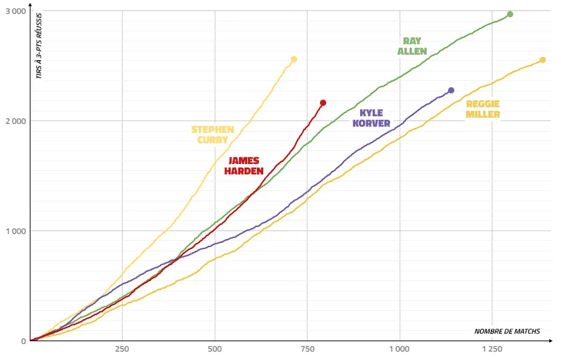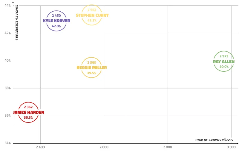 Leader de cette catégorie, Ray Allen le devance de 411 tirs, et cette nuit, le double MVP est devenu son dauphin en plantant son 2 561e panier primé en carrière, dépassant ainsi le total de Reggie Miller. L'ancienne gâchette des Pacers lui avait même préparé une surprise en intervenant, de chez lui, lors de la visioconférence d'après-match. “Tu inspires tellement de gamins, dont le mien” lui a dit Reggie Miller, avec son fils sur les genoux.