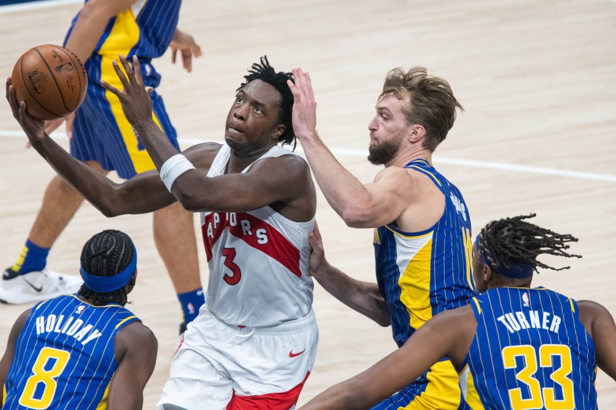 Avec sa défense sur Domantas Sabonis et son tranchant de l’autre côté, OG Anunoby étouffe ses adversaires, qui enchaînent les balles perdues : ils arrivent à la pause avec 13 turnovers, autant que leur moyenne par match. Toronto mène de 11 points (58-47) avec un OG Anunoby à 17 points à 7/10 et 5 interceptions.
