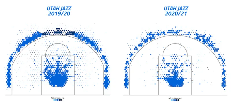 Les chiffres sont formels : avec 299 paniers primés marqués, le Jazz est l'équipe la plus prolifique de la ligue dans ce domaine. Et ça va même plus loin qu'un simple changement de mentalité, comme soufflé par Steve Kerr, car pour le moment, Utah inscrit 16.6 paniers à 3-pts par match. Si l'équipe conserve ce rythme et cette moyenne, ce sera tout simplement un record NBA, devant les Rockets de James Harden en 2018/19 (16.1 paniers primés par match) !
