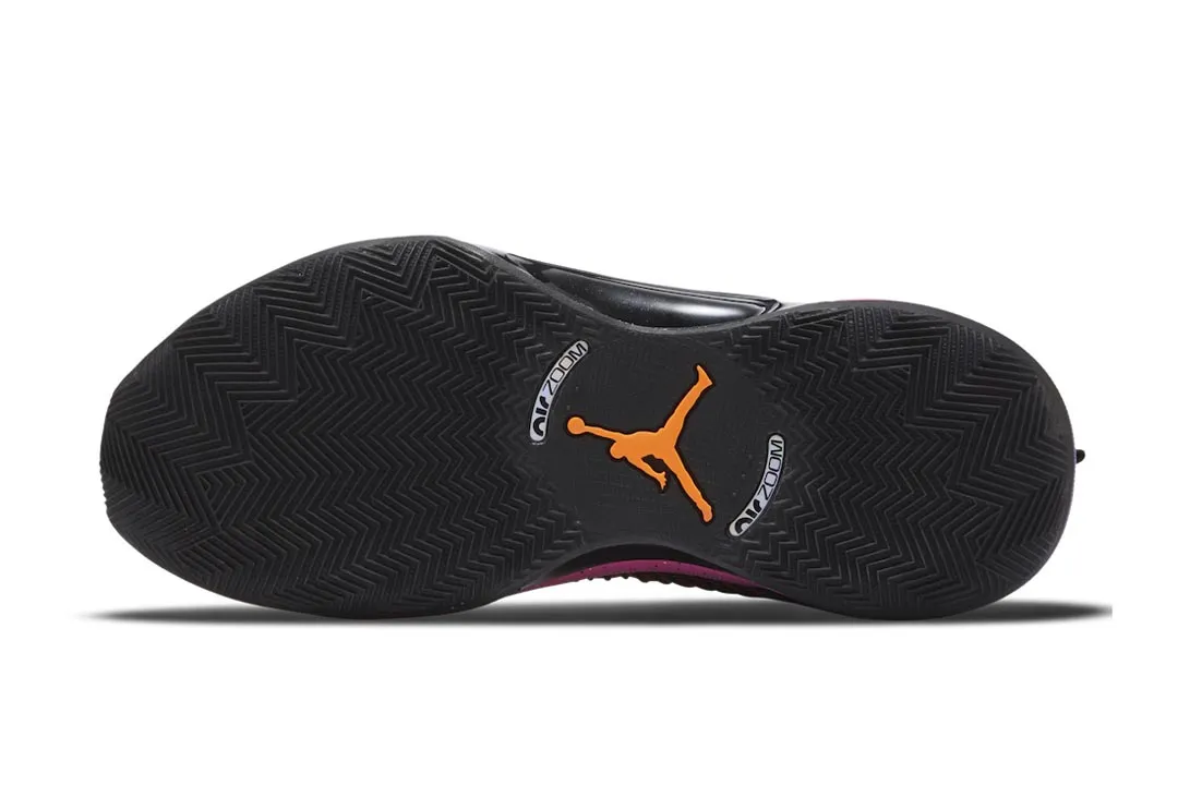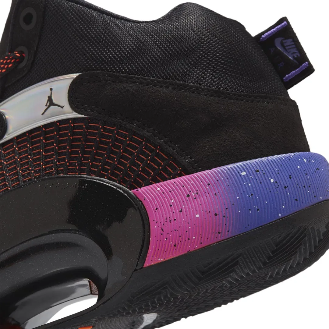 Le coloris « Sunset » est un grand classique sur le marché des baskets et Jordan Brand aurait tort de s'en passer sur la sublime Jordan 35. La marque a quand même choisi de faire la part belle au noir sur la majorité de la chaussure, mais ça permet de faire ressortir encore plus le dégradé allant du mauve jusqu'au orange présent sur les renforts latéraux, les lacets, et les différents « Jumpman ».