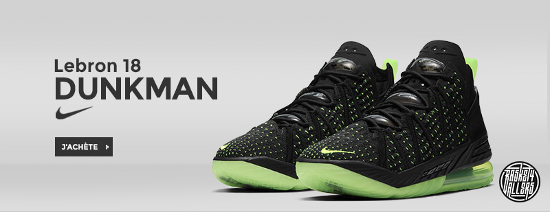Procurez-vous maintenant sur Basket4Ballers.com les Nike LeBron 18 célébrant le retour du coloris vert électrique et noir assorti de la célèbre silhouette représentant LeBron James : le Dunkman.