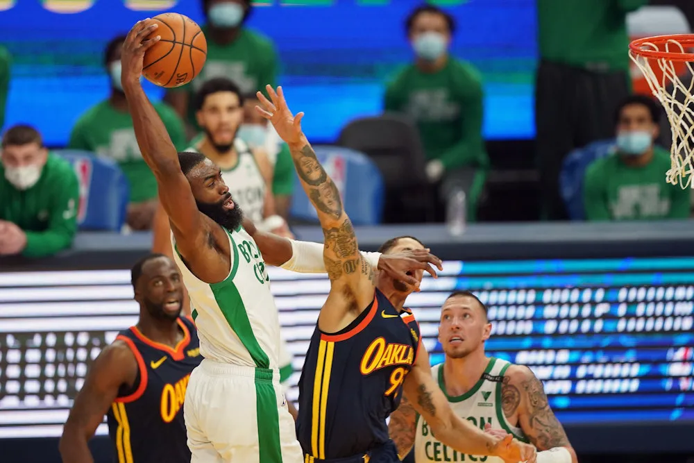 Le double MVP et Draymond Green (11 rebonds, 7 passes) sur le banc, et en l'absence de James Wiseman, blessé, Boston en profite pour faire payer le deuxième cinq de Golden State. Huit points de Jayson Tatum lancent un 19-5 pour entamer la deuxième période et permettre à Boston de passer devant (43-40).