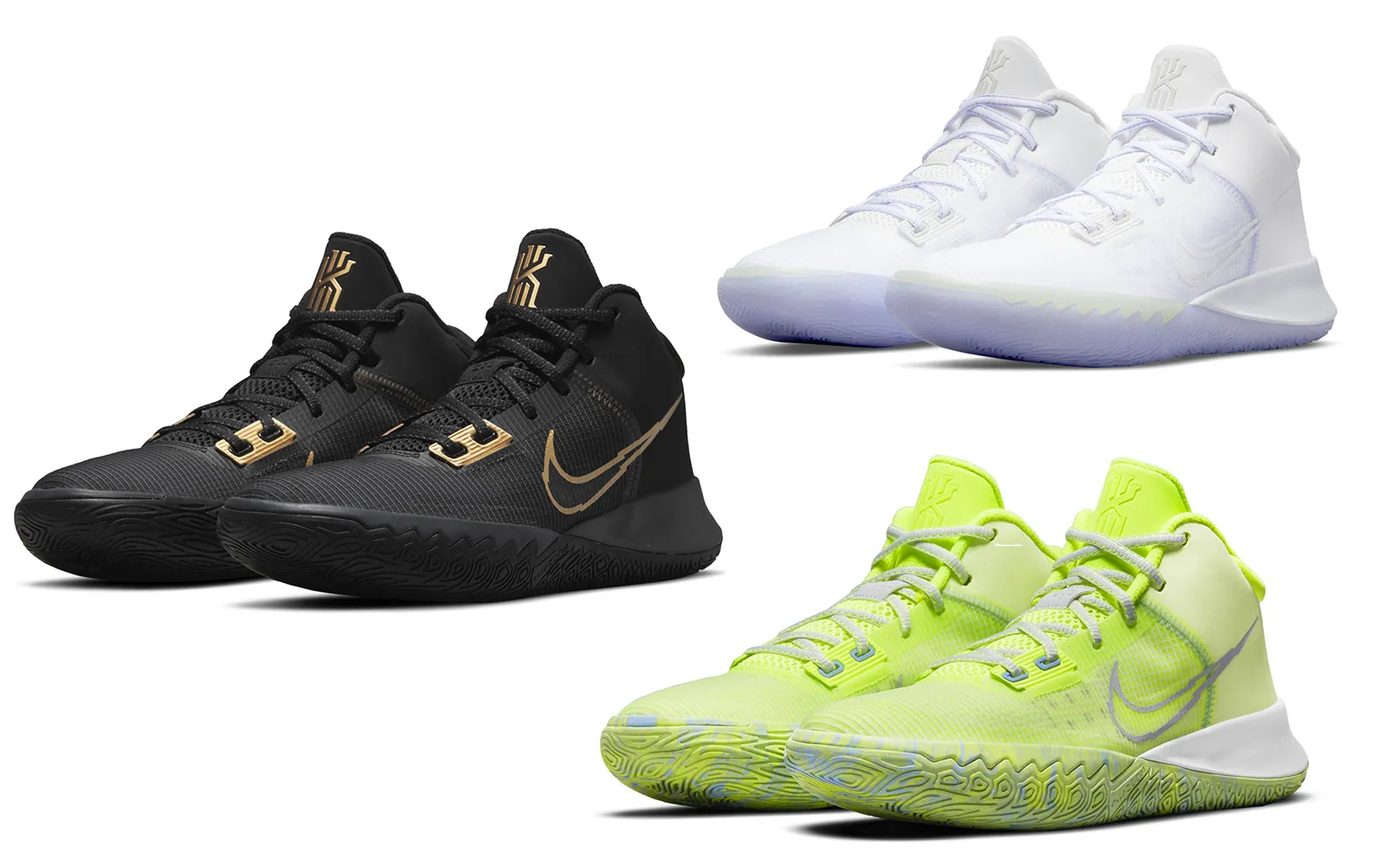 La Kyrie Flytrap fait partie des plus populaires, mais la quatrième paire de la collection veut visiblement relancer la machine vu les trois nouveaux modèles publiés par le compte Twitter US11. Après le blanc/noir/rouge inaugural, la paire a été entièrement couverte de rose, et elle le sera visiblement bientôt de blanc, et de jaune fluo. La noir et or est pour ceux qui préfèrent un rendu un peu plus sobre.