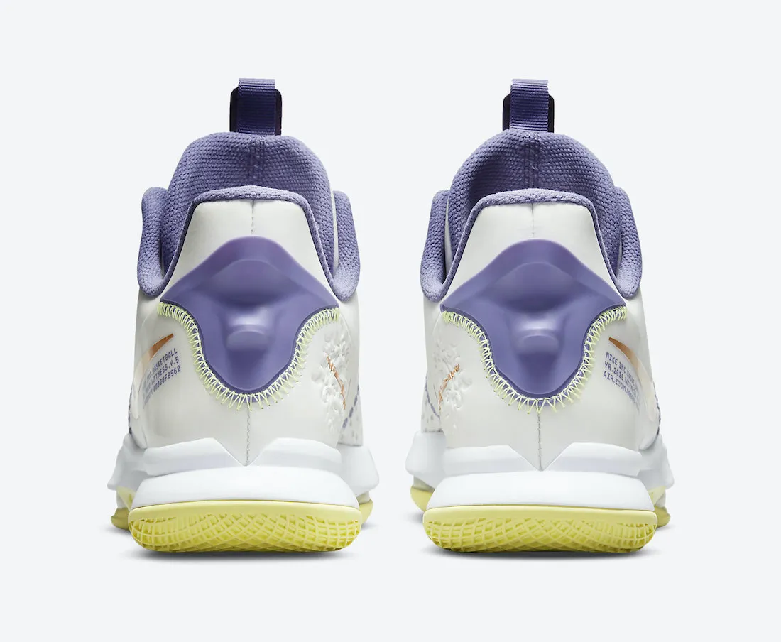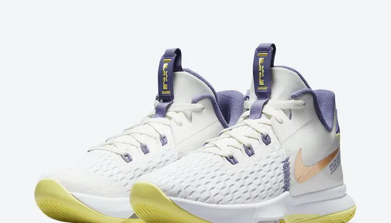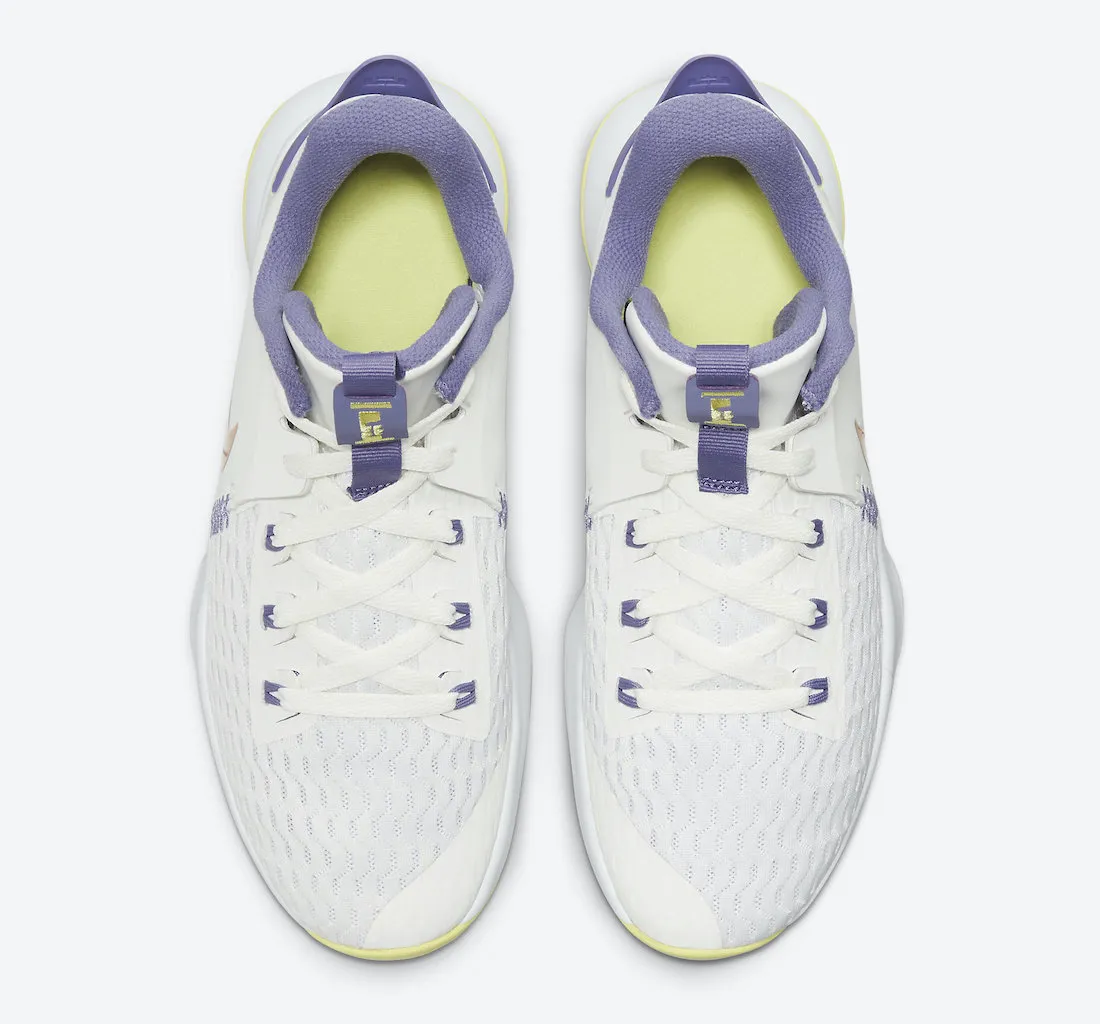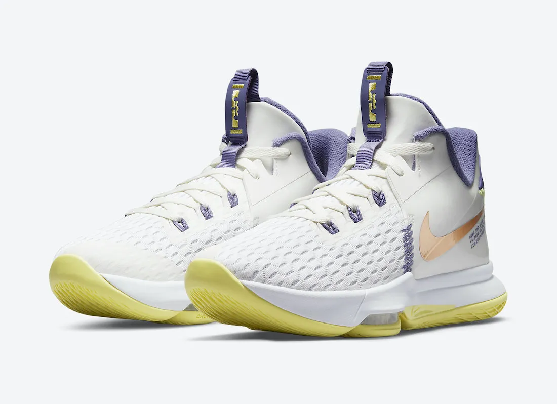 Joli combo commercial pour Nike avec la sortie imminente d'une LeBron Witness 5, ligne signature à prix réduit du King, aux couleurs des Lakers. Ces dernières sont un peu pastel mais la combinaison avec l'empeigne en mesh blanc donne un résultat très réussi. Le Swoosh doré vient préciser qui sont les champions en titre.