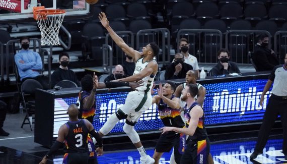Giannis Antetokounmpo a beau s’imposer à l’intérieur, malgré la faute, ce sont bien les Suns qui restent devant. Devin Booker donne +6 à 3 minutes de la fin mais Milwaukee va tout de même égaliser avec Khris Middleton qui frappe à 3-points dans le coin avant de servir Antetokounmpo au dunk, et à 47 points ! Giannis aura le tir pour la gagne au bout de doigts mais son tir ricoche sur le cercle, Phoenix s’impose sur le fil (125-124).