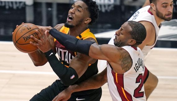 Tyler Herro maintient le Heat en tête avec son deuxième 3-points du match mais Utah commence à retrouver son jeu. Donovan Mitchell s’infiltre jusqu’au cercle pour une finition spectaculaire avant de finir les quatre fers en l’air. L’entrée de Jordan Clarkson, le 6e homme de luxe, aide aussi à réduire l’écart. Il sert pour le coup Mitchell qui écrase un gros dunk après rebond offensif.