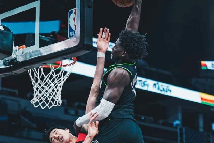 Néanmoins, on ne retiendra sans doute que la première action, tant ce poster d’Anthony Edwards sur Yuta Watanabe est dingue. Lancé ligne de fond, le rookie fait parler sa puissance pour aller au contact, garder le contrôle du ballon et claquer le cuir dans le cercle d’un coup de marteau qui va tourner très, très longtemps…