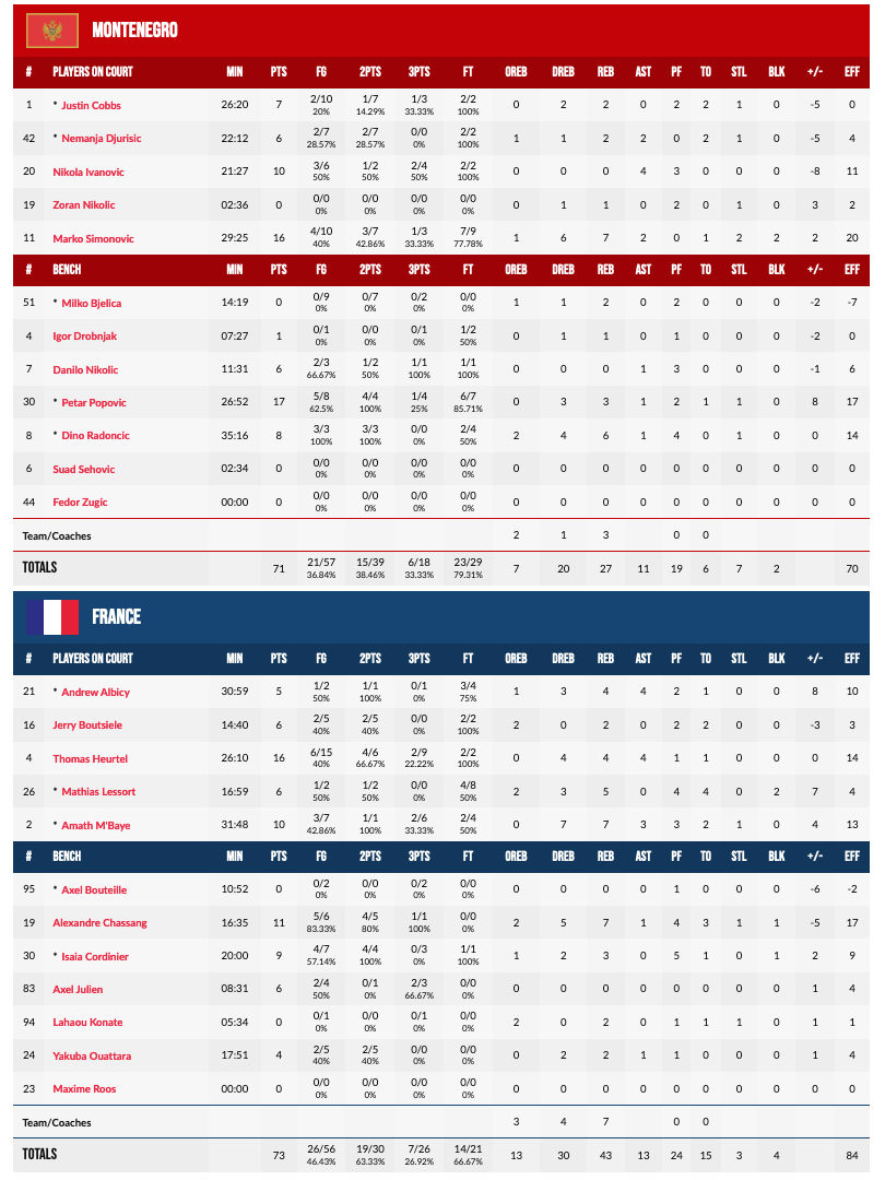 Marko Simonovic, clairement le Monténégrin le plus talentueux sur le terrain, redonne 7 points d’avance (64-57) à son équipe, mais Isaïa Cordinier sort enfin de sa boîte pour répondre par un énorme dunk ligne de fond. Amath M’Baye réussit un 3-points et Isaïa Cordinier, toujours aussi énergique, s’illustre encore au contre, avant que Thomas Heurtel ne donne enfin l’avantage aux Bleus (64-65) à quatre minutes de la fin de la rencontre.