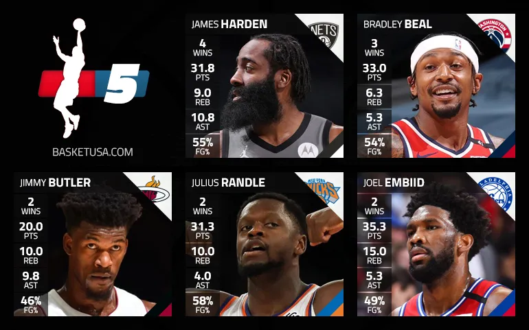 Honneur aux stars des équipes invaincues cette semaine avec le meilleur passeur et le meilleur marqueur de la NBA. Il y a d'abord James Harden, qui s'impose clairement comme le leader de Brooklyn par sa création et toujours sa faculté à marquer quand l'équipe a besoin. Les kilos ont disparu, la sélection de tirs est meilleure et sa complicité avec Kyrie Irving est grandissante. Du très grand Harden ! A ses côtés, à l'arrière, Bradley Beal, titulaire au All-Star Game alors qu'il avait été snobé la saison passée. Complet, il profite de la montée en puissance de Russell Westbrook et d'une meilleure défense pour mener les Wizards à une série de quatre victoires de suite.
