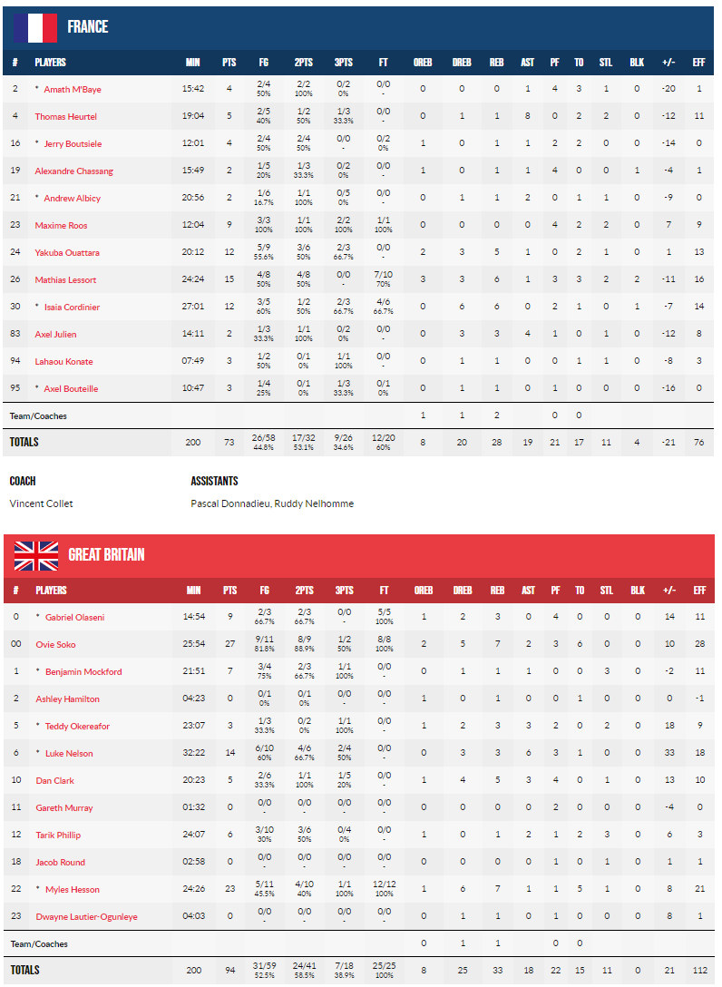 La paire de « Frenchies » Hesson-Soko va aller jusqu’à menacer la première place de la France au point-average en repassant à +21 (87-68), obligeant Isaïa Cordinier et Mathis Lessort à s’employer avant de voir Ovie Soko finir le job avec six points dont un gros dunk pour terminer la partie. Vaincus 94-73, les Bleus conservent toutefois la première place du groupe G, pour deux petits points. La Grande-Bretagne est qualifiée, contrairement au Monténégro.
