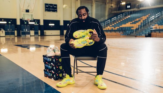 De prime abord, ces modèles semblent une réponse à la collection “Bob l’éponge” de Nike avec la chaussure signature de Kyrie Irving. Mais ces deux versions colorées de la Harden Vol. 5. sont en fait un clin d’œil à sa famille et ses amis ! Les couleurs clinquantes et les formes sont, selon la star des Nets, une manière de rendre hommage à sa maman. La colombe représente ses frères, tandis que la fleur est là en souvenir de son meilleur ami décédé.