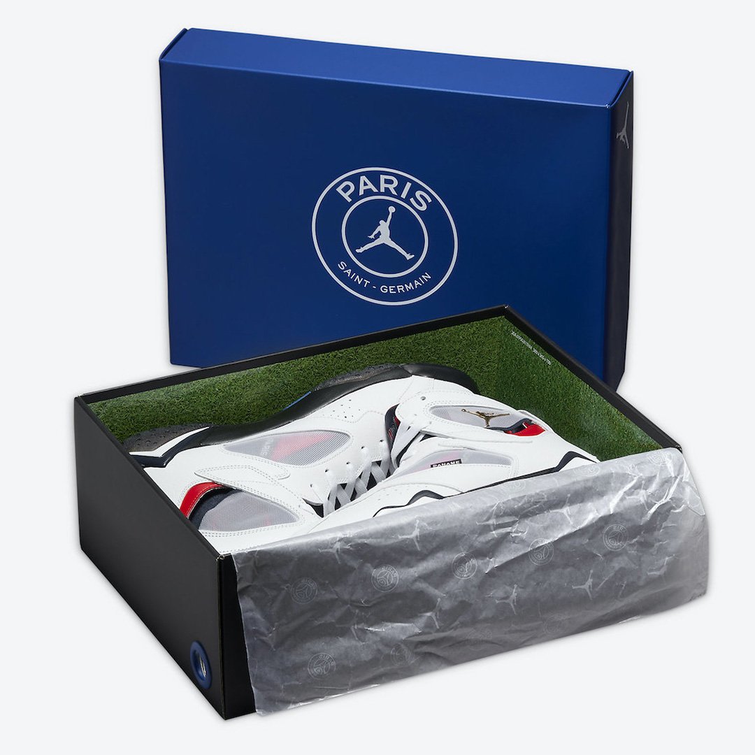 Au même titre que la « PSG x Air Jordan 4 » et la « PSG x Jordan Air Zoom Renegade », récemment dévoilées, cette version fait la part belle au Paris Saint Germain, à travers son packaging et bien sûr ses couleurs à dominante blanche, rouge et bleu, présentes sur le logo du club. Celui-ci est subtilement évoqué au niveau du talon. Quant aux références en guise de clin d’œil au club parisien, elles sont nombreuses, avec une étiquette « Paname » bien visible sur l’empeigne ainsi que plusieurs slogans « Ici c’est Paris », sous la semelle ou à l’intérieur de la basket notamment.