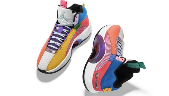 Déjà déclinée sous pas mal de versions différentes, la « Air Jordan 35 Kiyan PE » (pour « Player Edition ») se veut riche en couleurs, avec une superposition d’orange, de rouge pâle, de bleu et de jaune sur les côtés.