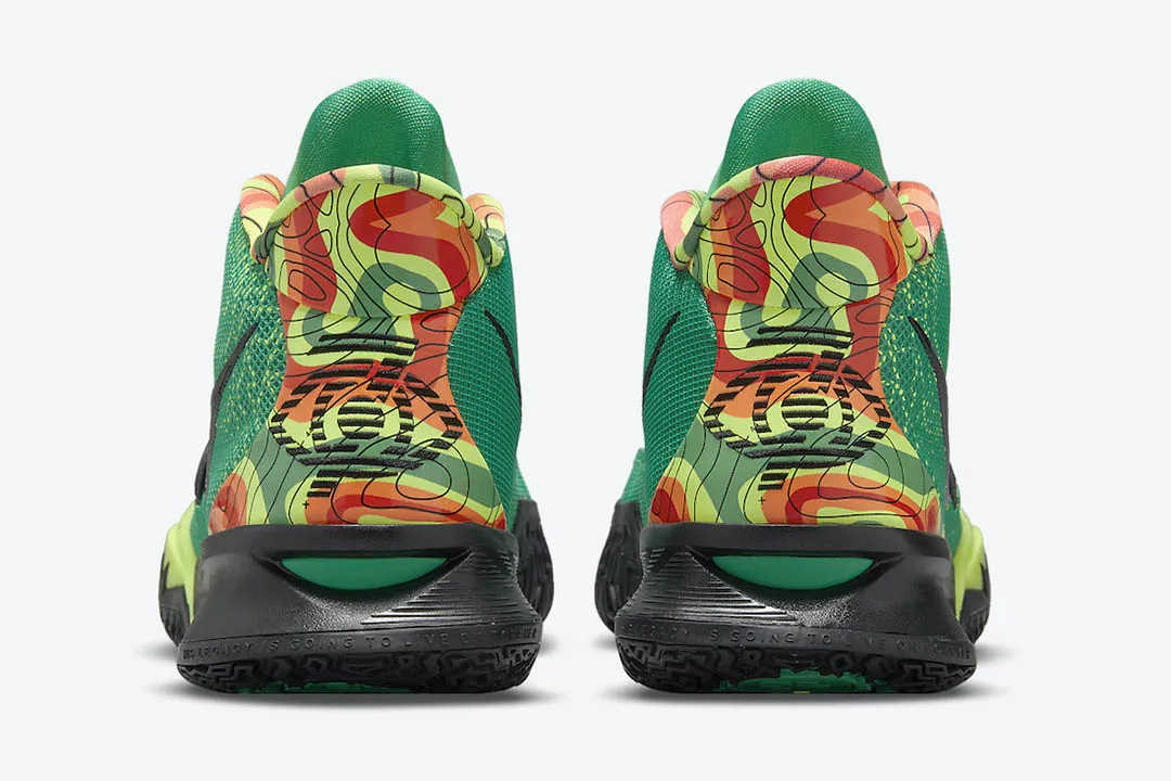 Un œil noir avec le 7 intégré vient rappeler le numéro du modèle sur le talon. L'empeigne et le devant de la chaussure sont majoritairement teintés de vert. La semelle est noire avec deux insertions de vert, pâle à l'avant et émeraude à l'arrière. Le noir entoure également le signe Nike.