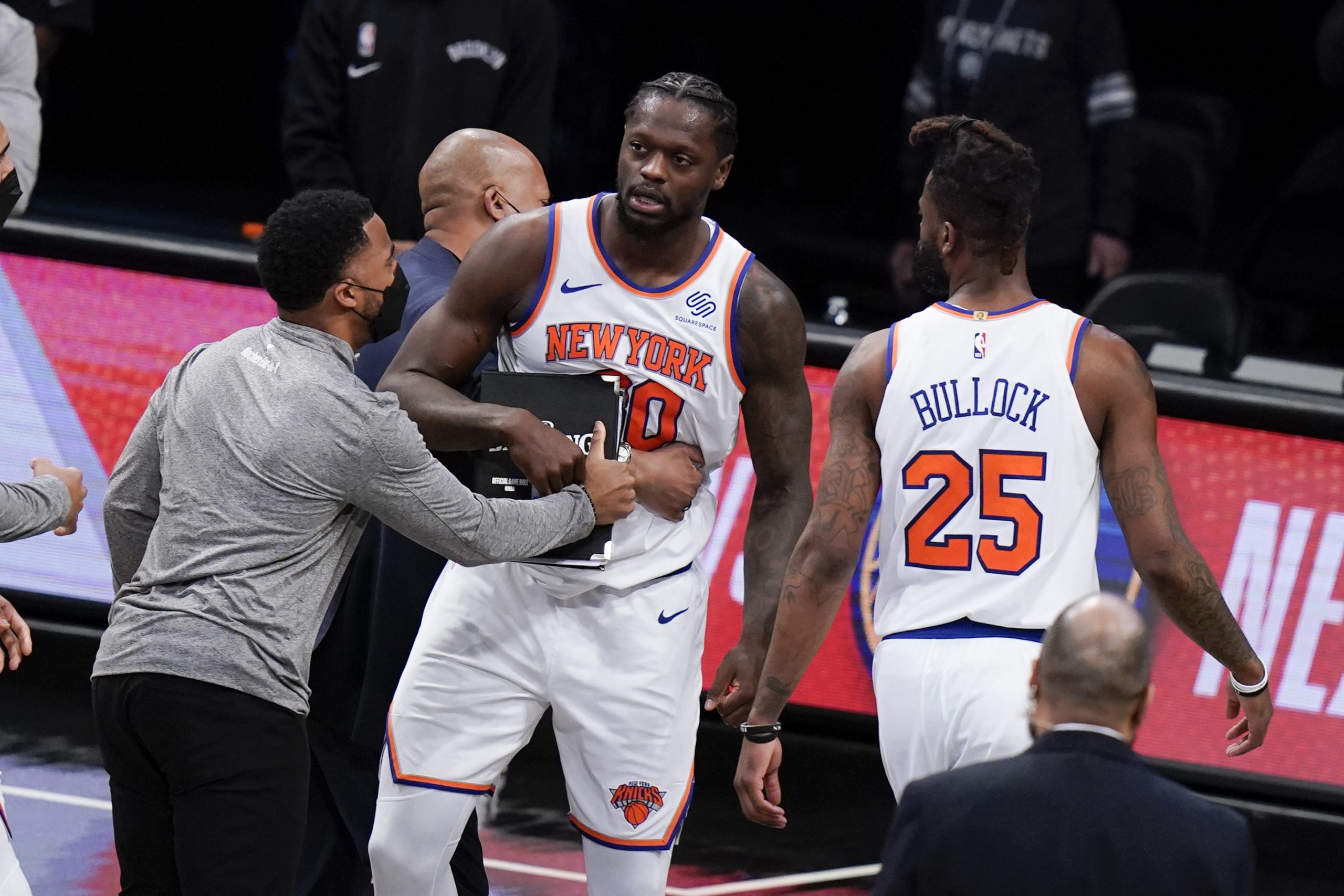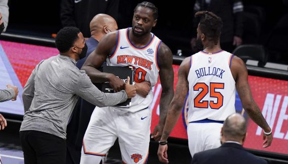 C’était à prévoir. Après s’être énervé une première fois contre les arbitres, pour un marcher, lors de la défaite sur le fil face à Brooklyn, Julius Randle s’était de nouveau emporté, suite à une faute décisive qui lui avait été sifflée au rebond, sur Tobias Harris, dans le “money time” face aux Sixers.