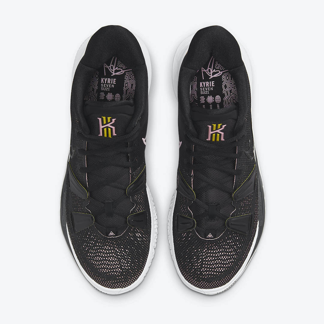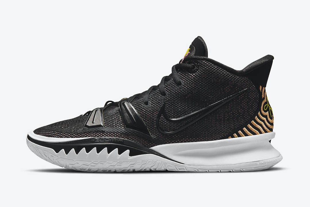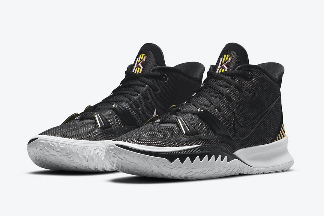 Après un récent voyage remarqué en Égypte ou un hommage à l’héritage hip-hop de Brooklyn, Nike opère un retour aux bases pour sa nouvelle version de la Kyrie 7, sortie en octobre dernier. Un modèle sobre, foncé, avec le même maillage que le modèle original sur le devant et l’empeigne, en noir et jaune cette fois. Le logo intérieur Nike possède des contours roses, l’extérieur des contours noirs.