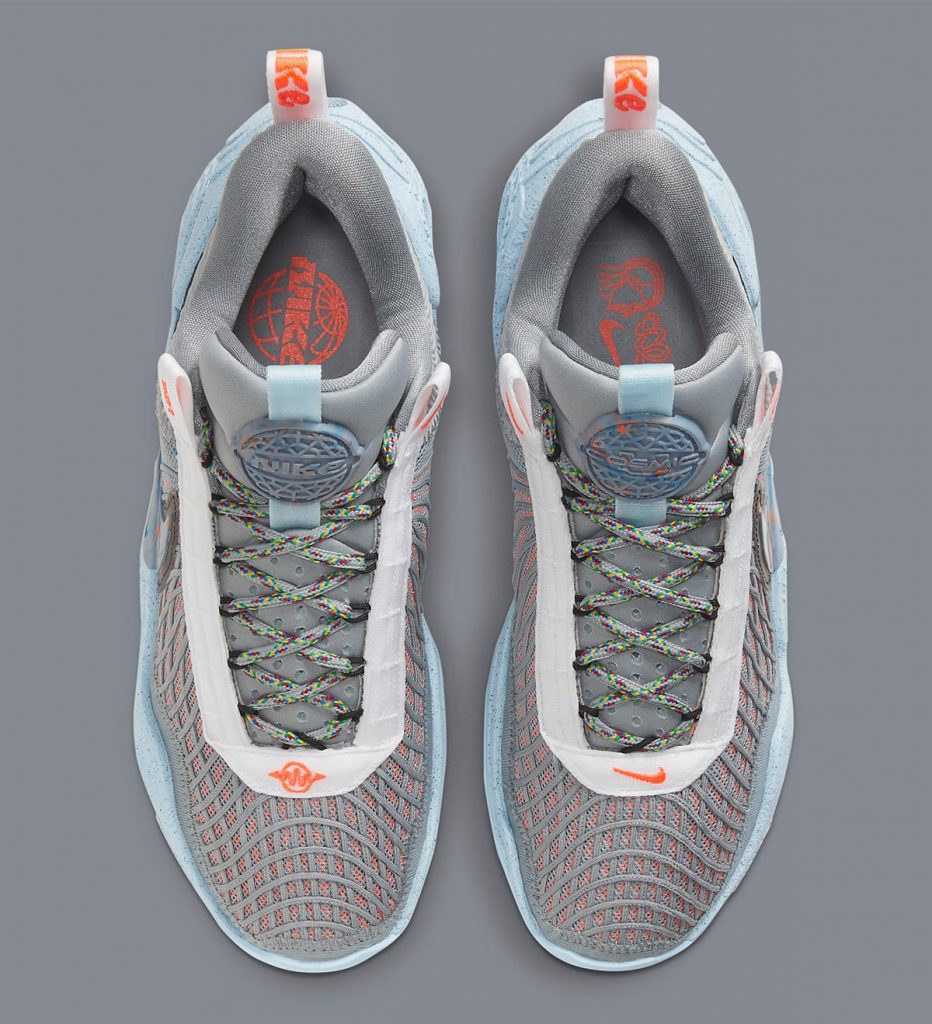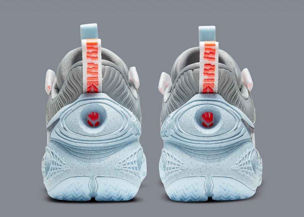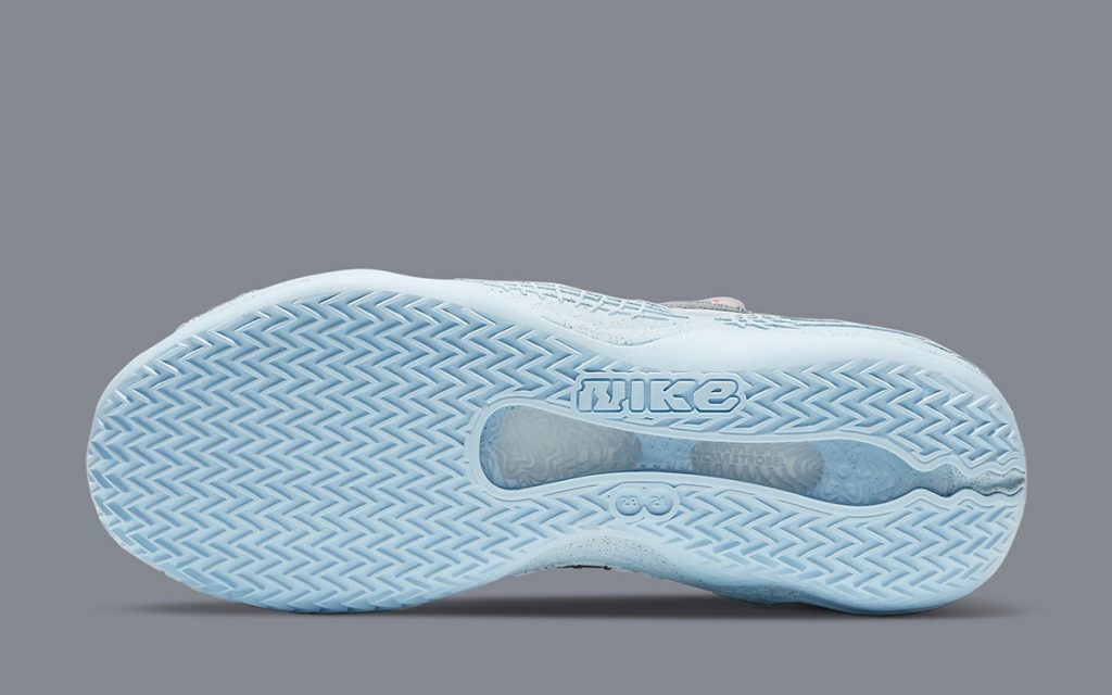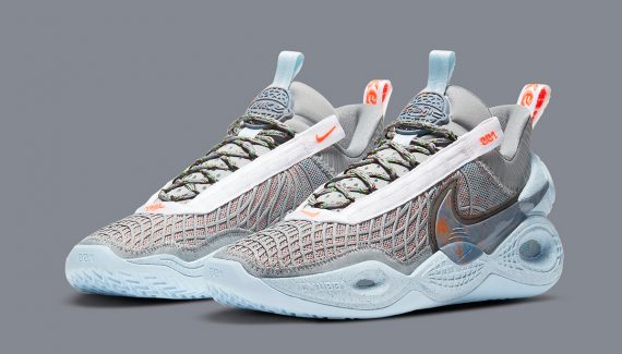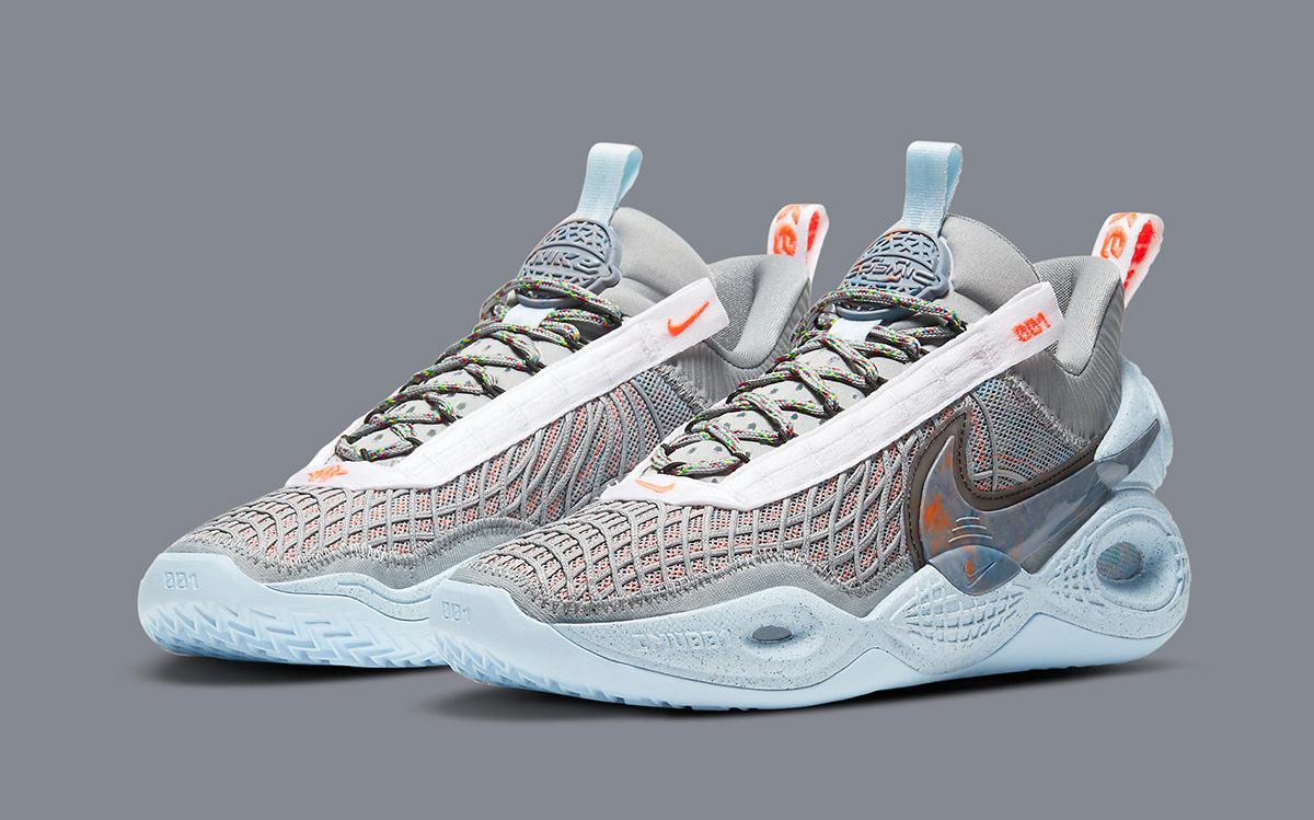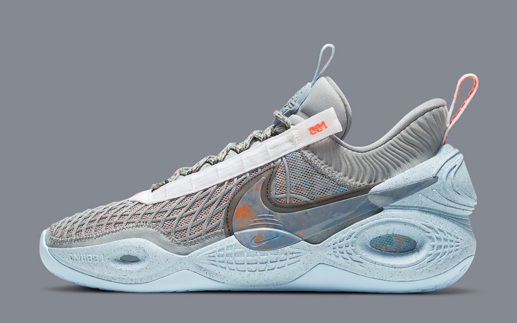 Le signe « Nike » en TPU (polyuréthane thermoplastique) recyclé fait ressortir un côté marbre, et mord sur la semelle bleu-clair “granite” en « Crater Foam », matériau dur fabriqué à partir de matières recyclées, déchets d’usines surnommés « débris spatiaux » au sein de la marque à la virgule. On est bien dans le thème !