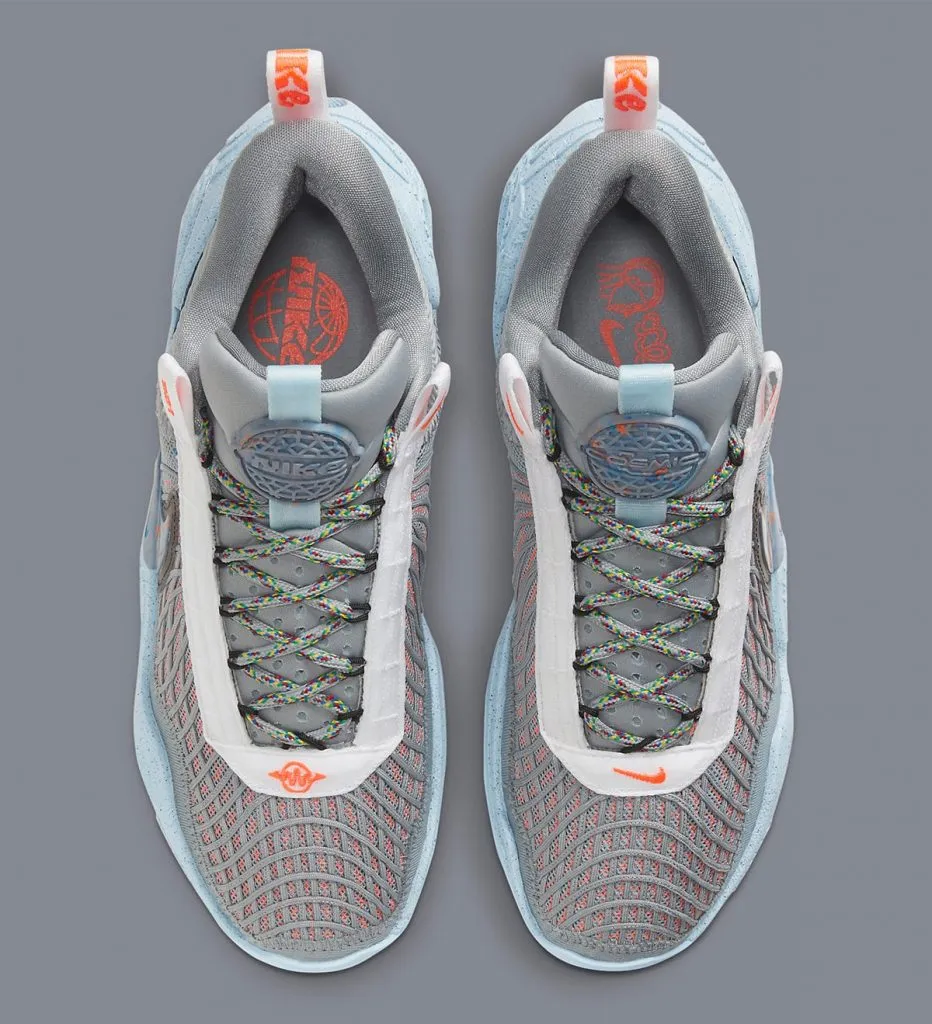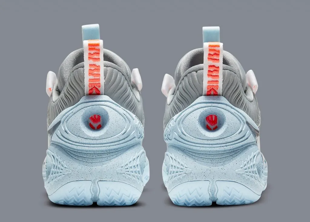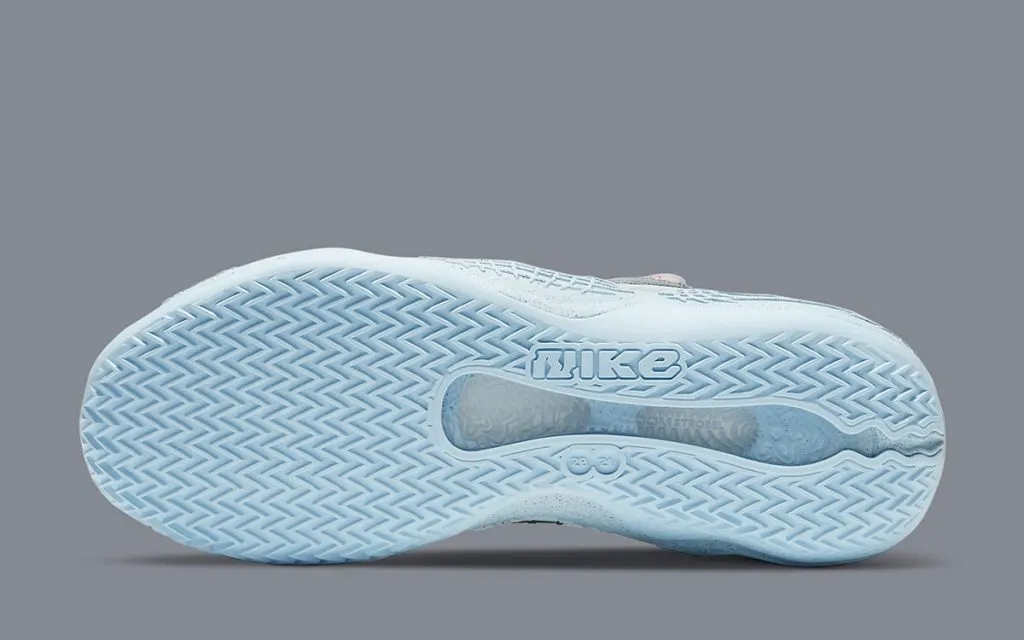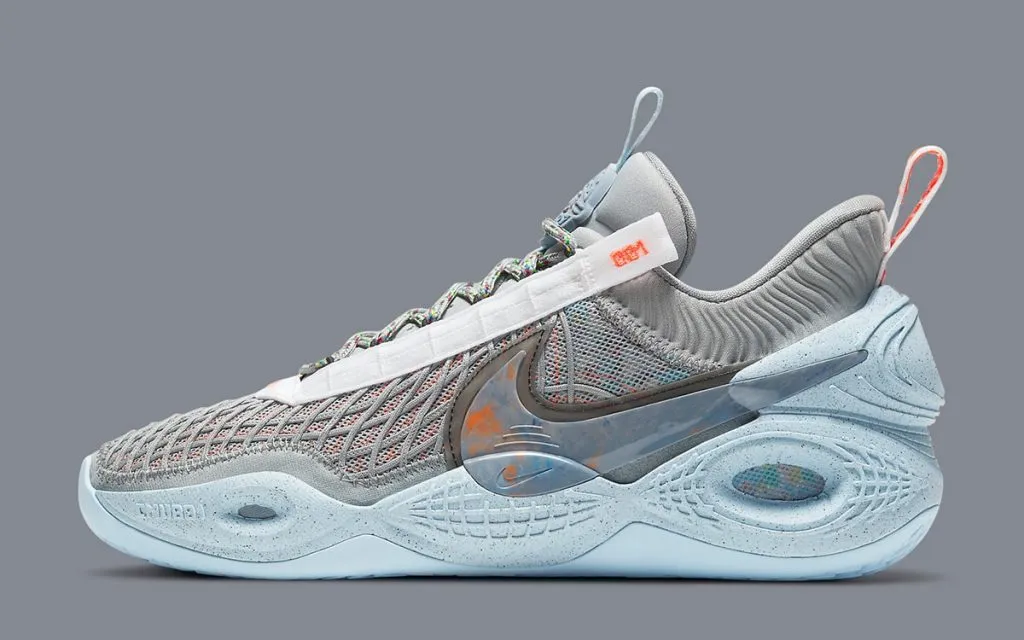 Le signe « Nike » en TPU (polyuréthane thermoplastique) recyclé fait ressortir un côté marbre, et mord sur la semelle bleu-clair “granite” en « Crater Foam », matériau dur fabriqué à partir de matières recyclées, déchets d'usines surnommés « débris spatiaux » au sein de la marque à la virgule. On est bien dans le thème !