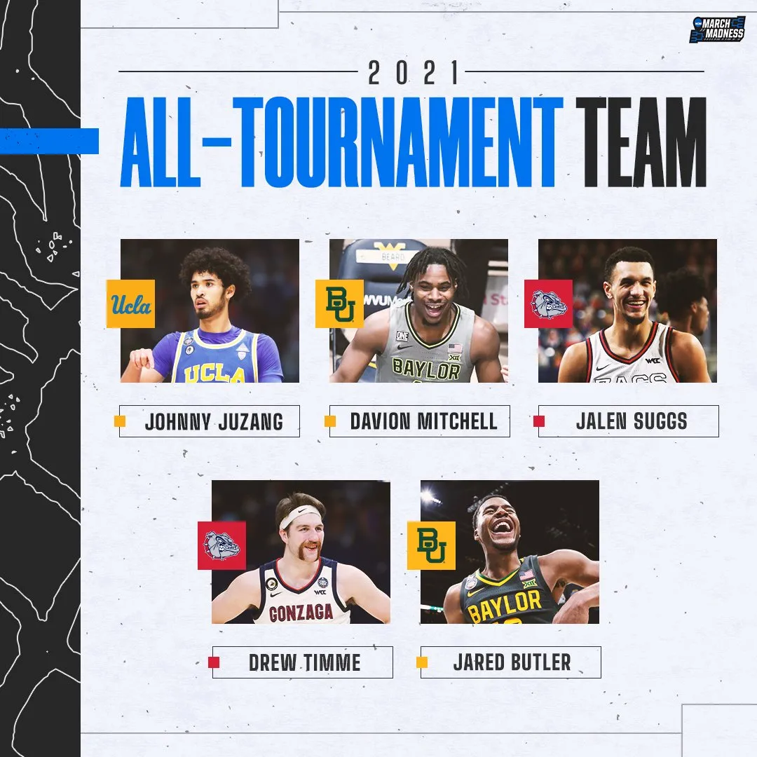 Jared Butler est accompagné de son coéquipier, Davion Mitchell, dans le cinq majeur du tournoi, ainsi que des deux Zags, Jalen Suggs et Drew Timme alors que c'est le scoreur fou de UCLA, Johnny Juzang, qui complète la rotation.