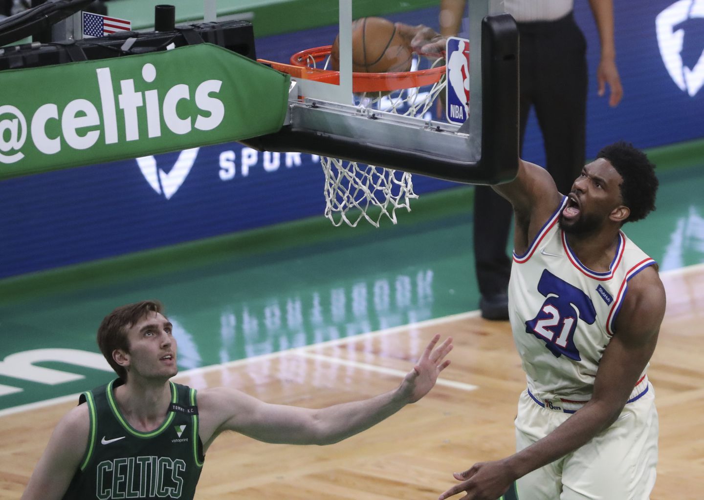 Le jeune intérieur des Celtics est actif mais il a face à lui le meilleur pivot de sa conférence, et peut-être le pivot le plus doué au poste bas. Résultat : ses deux fautes rapides l’obligent à sortir. Philadelphie profite de son avantage physique pour faire poster aussi Tobias Harris et Ben Simmons afin de forcer les Celtics à venir en aide, ce qui permet de libérer Danny Green et Seth Curry à 3-points.