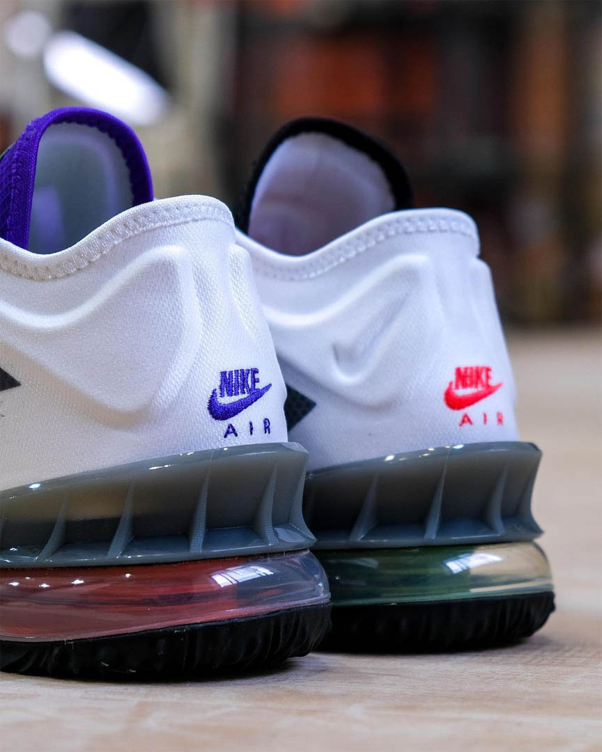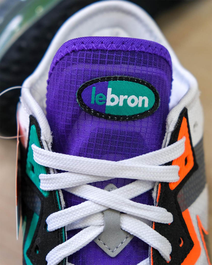 Même principe avec les languettes, l’une étant violette et grise et l’autre noire et grise. Le prénom « LeBron » vient remplacer le classique « Air Max » sur chaque languette, là encore aux coloris dépareillés. Le modèle est complété par semelle extérieure en caoutchouc noir.