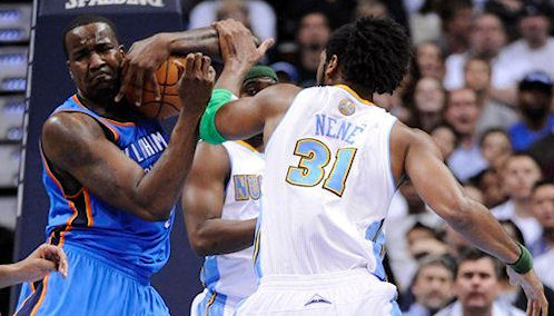 Ty Lawson pénétrait avec brio dans la raquette du Thunder, marquant malgré le contact avec Ibaka. Il finit avec 28 points (career best). Kenyon Martin (14 points) nous gratifiait d’une claquette surpuissante dont il a seul le secret. Kendrick Perkins arrivait quant à lui à pousser Nene à la faute… technique, en l’occurrence. L’ours grognon attrapait 14 rebonds.