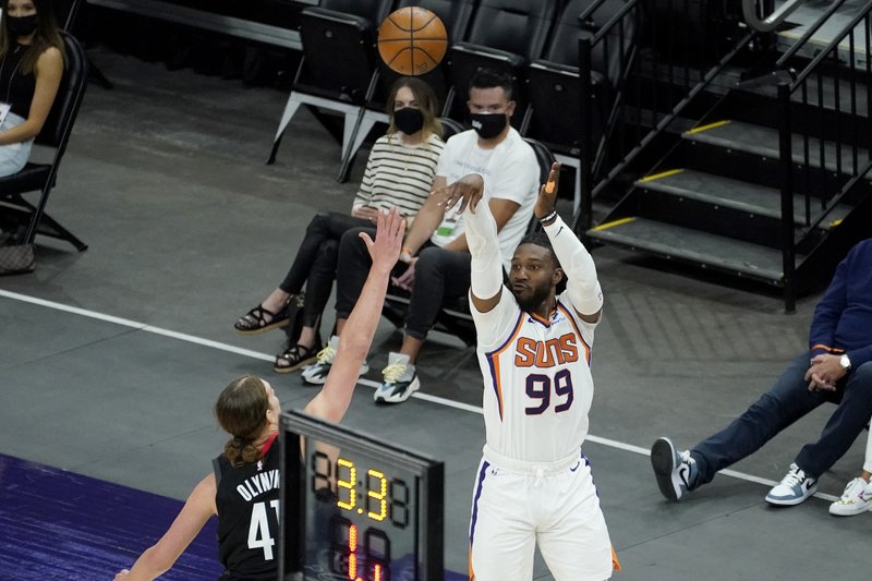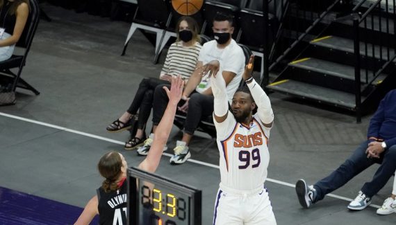 Ça reprend fort pour Phoenix en deuxième quart-temps. Les 3-points tombent avec Jevon Carter qui fait 3/4 derrière l’arc. Dario Saric l’imite et l’écart enfle. Quand Porter Jr. s’envole pour un dunk après une interception, les Suns reviennent en trois passes de l’autre côté du terrain et Crowder a déjà sanctionné avant même que KPJ ait pu revenir en défense…